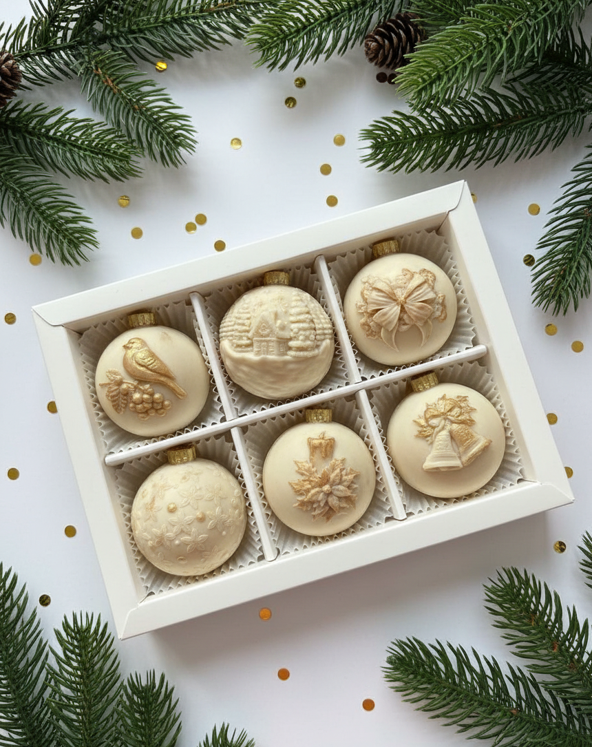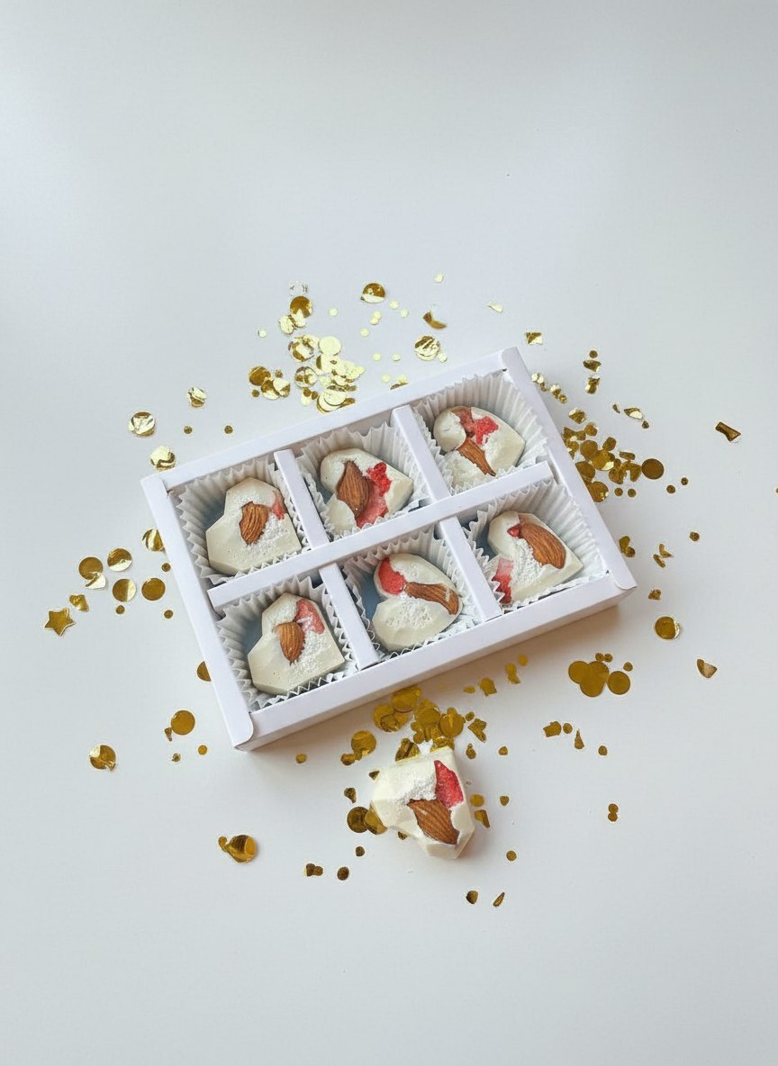 Конфеты из белого шоколада с начинкой из сублимированной клубники, миндаля, кокоса и воздушного риса.