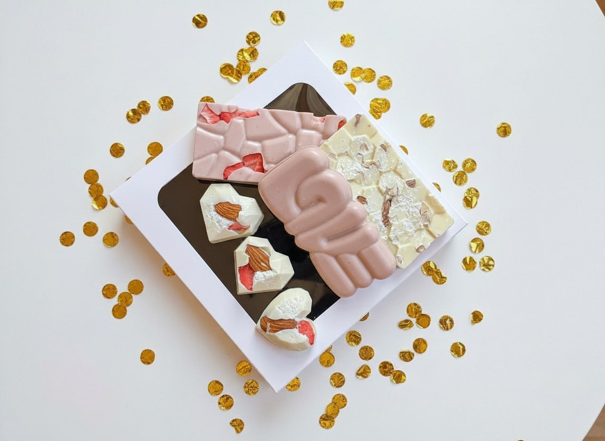 Шоколадная плитка из белого шоколада. Шоколадная плитка из белого шоколада с миндалем и кокосом. Шоколадная плитка из белого шоколада с сублимированной клубникой.